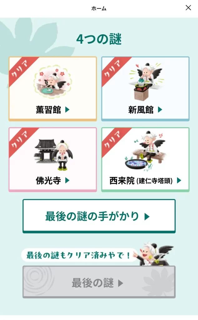 4つの謎すべてにクリアすると「最後の謎」に進むことができます。