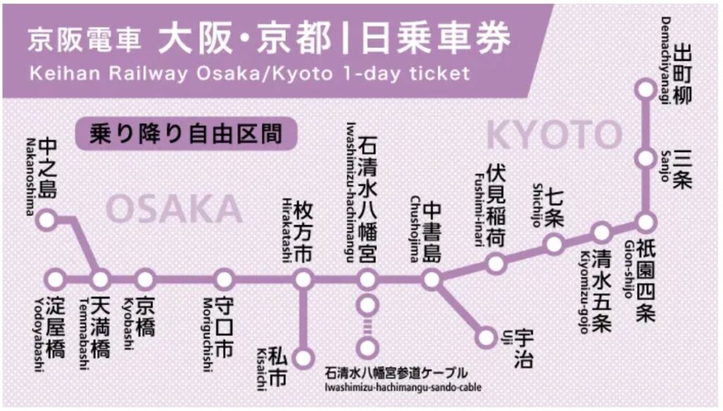 京阪線全線と石清水八幡宮参道ケーブルが乗り降り自由。